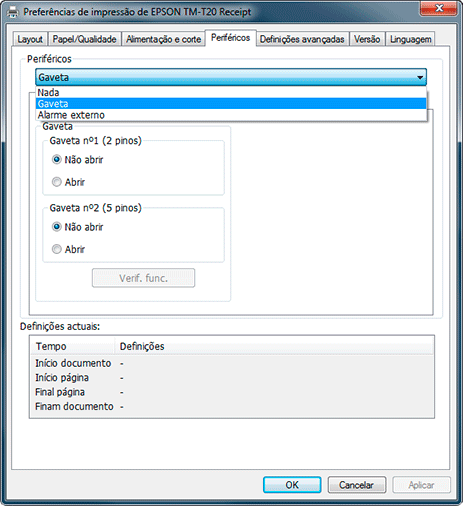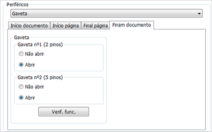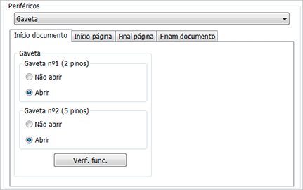 Nas preferências de impressão, na aba periféricos, selecione gaveta: