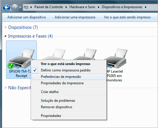 Após abrir os Dispositivos e Impressoras, localize a impressora Epson, clique com o botão direito do mouse sobre ela e vá até a opção Preferências de Impressão: