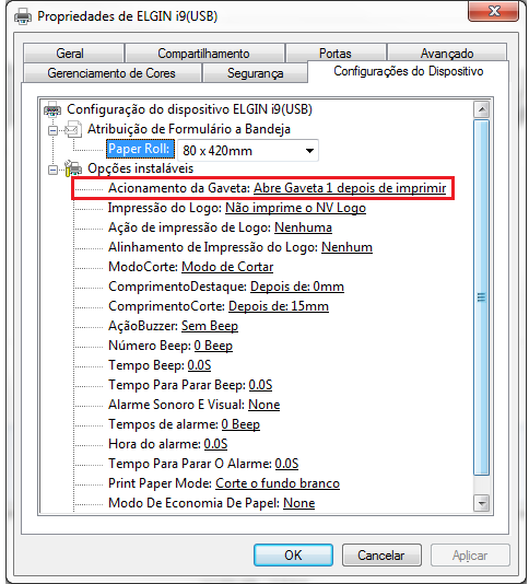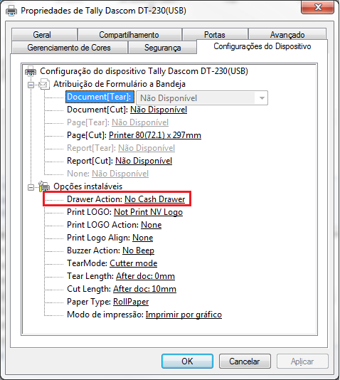 Para os modelos Tally Dascom DT-230 e Elgin i9 , acesse dentro do Painel de Controle do Windows > Dispositivos e Impressoras. Localize a impressora na lista, clique com o botão contrário do mouse sobre a mesma e escolha Propriedades da impressora. Clique em Configurações do Dispositivo e altere a opção para acionamento da gaveta: