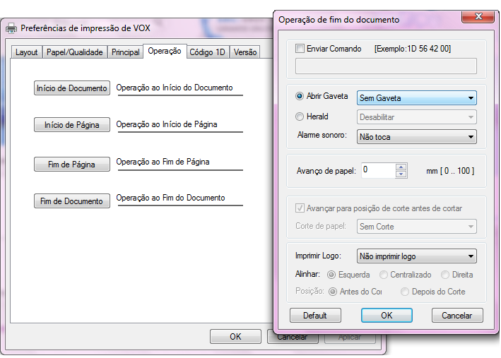 Para o modelo Elgin VOX, acesse dentro do Painel de Controle do Windows > Dispositivos e Impressoras. Localize a impressora na lista, clique com o botão contrário do mouse sobre a mesma e escolha Preferências de impressão. Clique em Operação > Fim de Documento e altere a opção para abertura da gaveta: