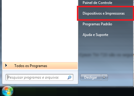 Clique no botão iniciar do Windows e acesse Dispositivos e Impressoras.