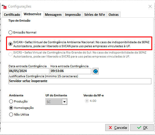 Marque o SVCAN (SEFAZ Virtual de Contingência Ambiente Nacional): AC, AL, AP, DF, ES, MG, PB, RJ, RN, RO, RR, RS, SC, SE, SP, TO;