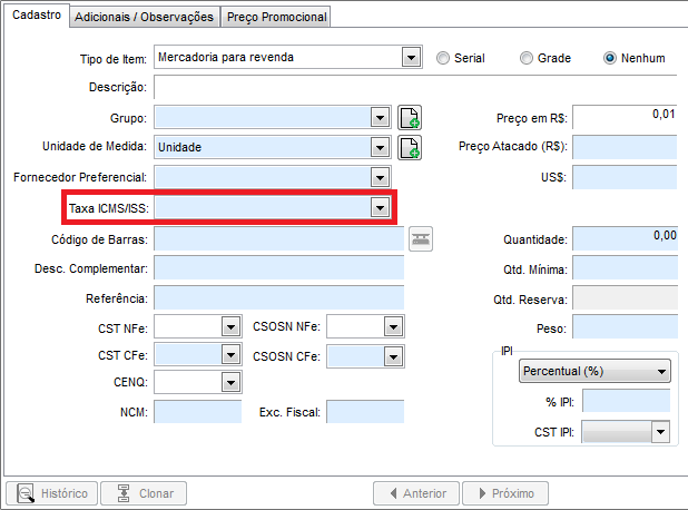 3. Agora, abra o cadastro do(s) produto(s) no controle de estoque, altere o campo "Taxa ICMS/ISS" selecionando a respectiva taxa cadastrada anteriormente.