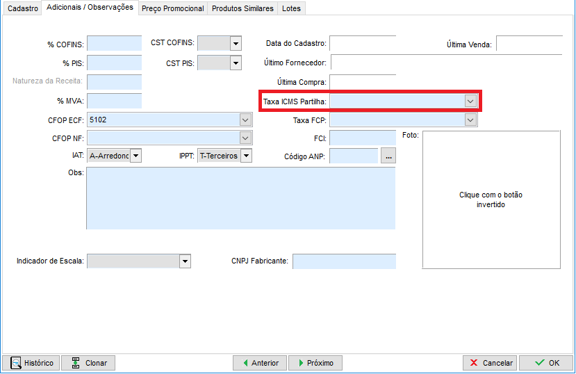 - Na aba “Adicionais / Observações”, identifique o campo “Taxa ICMS Partilha” e caso o mesmo esteja preenchido, deixe-o em branco, sem nenhuma informação.