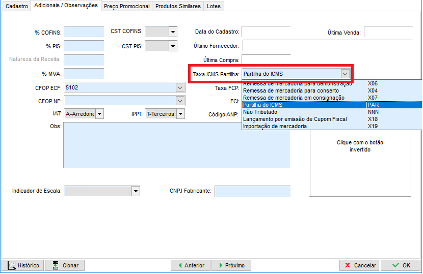 - Acesse o cadastro do(s) produto(s), vá na guia Adicionais/Observações e defina Taxa ICMS Partilha no cadastro do produto.