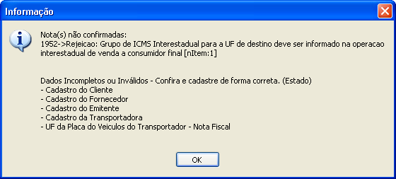 Rejeição: Grupo de ICMS Interestadual para a UF de destino deve ser informado na operação interestadual de venda a consumidor final