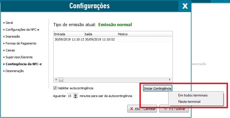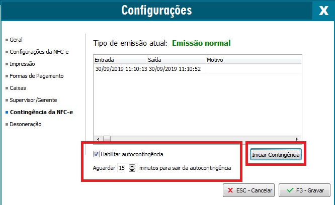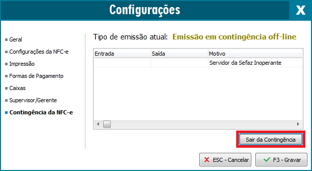Após o serviço ter retornado a operação normal, o seu sistema deve ser configurado para a emissão normal de NFC-e. Para isso, nas Configurações (ou pressionando a tecla F10), acesse novamente a guia Contingência da NFC-e e clique no botão Sair da Contingência, na tela que for apresentada, clique em Sim confirmando que deseja retornar a emissão Normal.