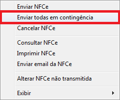 Existe também a possibilidade de autorizar todas as notas emitidas em contingência de uma vez, para que não seja necessário autorizar uma nota por vez. Para isso, na lista de Vendas Emitidas (F7), clique com o botão direito do mouse na relação de notas apresentadas, vá em Exibir e clique na opção Cfes em Contingência. Em seguida, clique com o botão direito do mouse sobre uma das notas apresentadas e clique na opção Enviar todas em contingência. Para concluir, aguarde a autorização de todas as NFC-e’s.