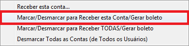 Neste momento, clique com o botão direito sobre uma das contas que deseja gerar boleto e clique na opção Marcar/Desmarcar para Receber esta Conta/Gerar boleto.