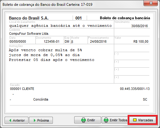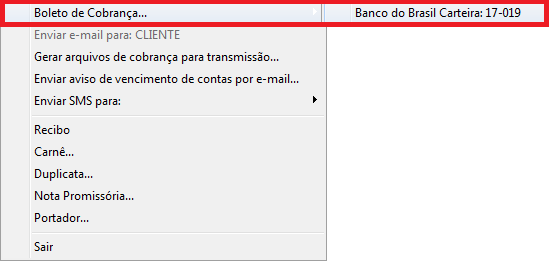 Em seguida, acesse o menu Arquivo, vá até Boleto de Cobrança ou clique no atalho referente ao mesmo e selecione a carteira que já encontra-se configurada conforme citado anteriormente.