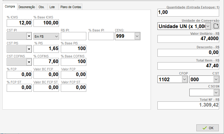 Após importar o XML poderá verificar na nota que o produto foi lançado corretamente conforme informações parametrizadas anteriormente no cadastro do fornecedor: