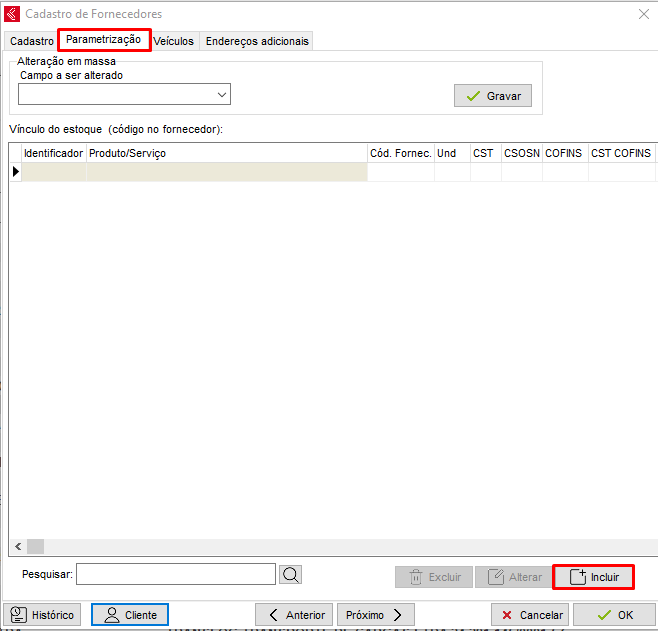 Após informar os campos, clique em Gravar, todas as parametrizações gravadas contarão com a informação que foi lançada.