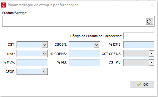 Para parametrizar um produto clique sobre o botão “Incluir” e informe o produto que já deve estar previamente cadastrado no estoque. Em seguida, preencha as informações a serem parametrizadas e clique no botão OK.