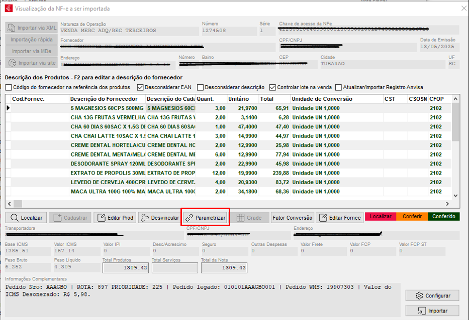 Ao importar um XML deste fornecedor que contenha os produtos parametrizados, estes ficarão automaticamente com o status "Conferido" e os campos parametrizados serão ajustados automaticamente: