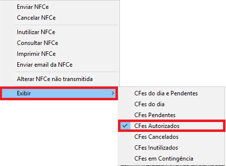 Acesse o Gerenciador do SAT, clique com o botão direito do mouse e vá até a opção Exibir. Em seguida selecione a opção CFes Autorizados