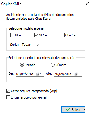 Ao clicar neste ícone será apresentada a tela de Copiar XML's. Informe o número dos CFes dos quais deseja copiar ou o intervalo de data dos arquivos e clique em Salvar para indicar onde deseja salvar os arquivos.