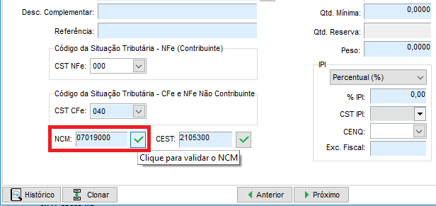 IMPORTANTE: Verifique com sua contabilidade qual o código NCM será utilizado e caso necessário qual Exceção Fiscal deve ser preenchida.