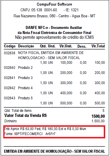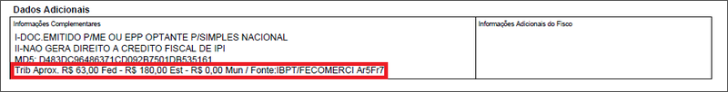 Conforme regulamentação da Lei nº 12.741, de 8 de dezembro de 2012, novo decreto nº 8.264, de 5 de junho de 2014 esses valores também serão destacados separadamente por Valores Aproximados: Federal Estadual e Municipal.