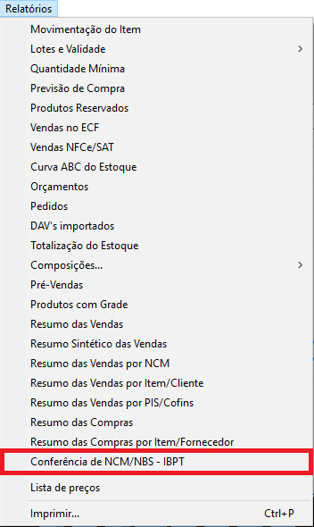 No Clipp Store é possível gerar um relatório para conferir o NCM/NBS cadastrado em seus produtos de acordo com a tabela do IBPT. Para gerar o relatório abra o módulo Estoque, clique no menu Relatórios > Conferência de NCM/NBS – IBPT.