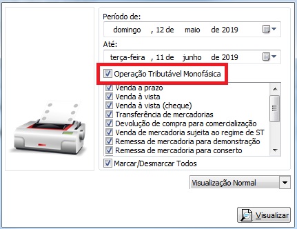 Após acessar o Resumo, marque a opção Operação tributável monofásica juntamente (caso queira) com as naturezas de operação a serem consideradas no relatório.