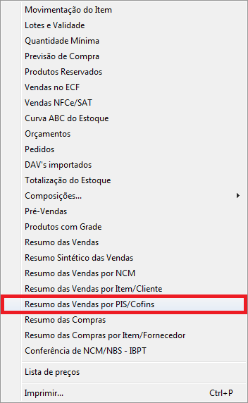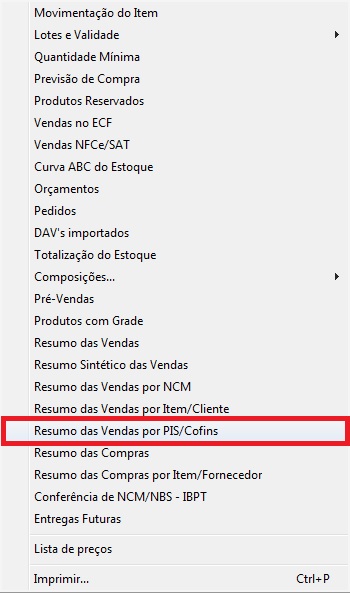 Após acessar o módulo, clique em Relatórios - Resumo de vendas por PIS/COFINS