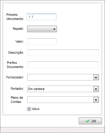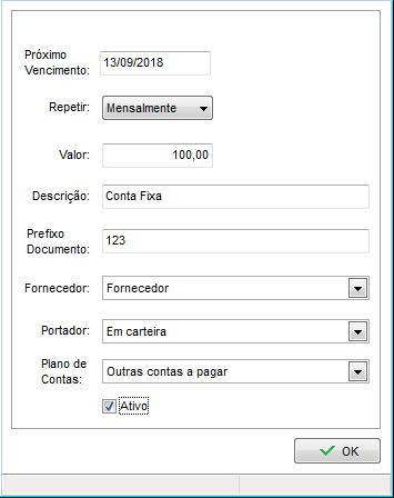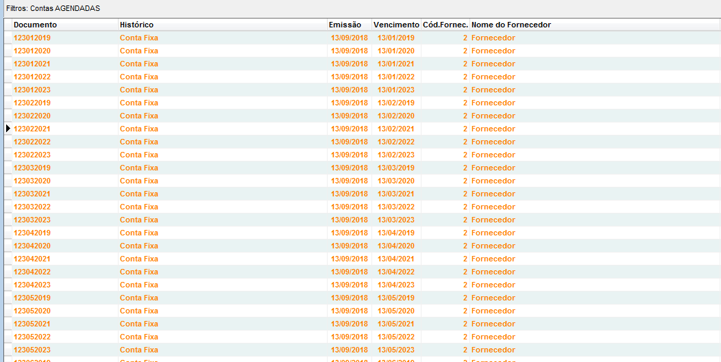 Para gravar o cadastro clique em OK. Serão geradas as contas em seu sistema referente a um período de 5 anos conforme informado anteriormente, porém as mesmas seguirão o intervalo informado no cadastro além de estarem com o status de Agendadas.