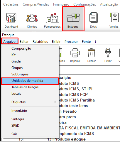Primeiramente deverá realizar o cadastro uma unidade de medida. Para isso, acesse o módulo de Estoque, clique em Arquivo e vá até Unidades de Medida.