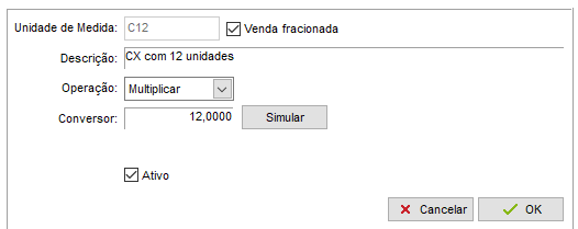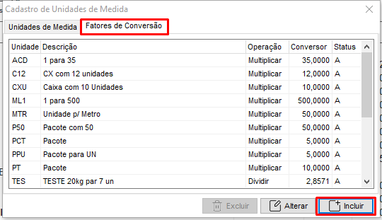 Feito isso, clique em Incluir e nos campos que forem apresentados, defina uma sigla para a Unidade de Medida, preencha a Descrição com uma informação que venha a auxiliar na identificação do conversor, preencha a operação Multiplicar e preencha o campo Conversor com o número de unidades menores que compõem a unidade interna, para concluir, clique em OK.