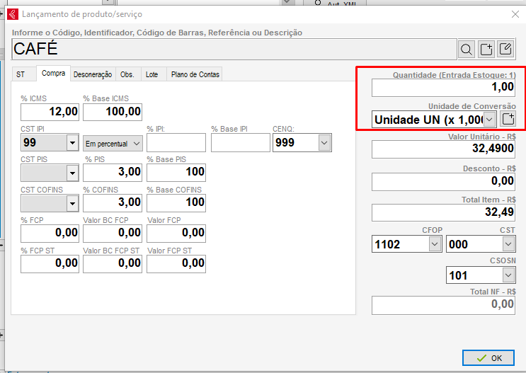 Ao lançar o produto, selecione no campo Unidade de Conversão o fator de conversão cadastrado anteriormente, observe que acima do campo Quantidade será apresentada a descrição Entrada Estoque com a respectiva quantidade que será acrescentada no cadastro do produto.