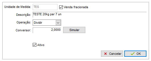 Será necessario alterar o campo Operação para Dividir, assim fazendo que 2 unidades virarão 1kg, por exemplo.