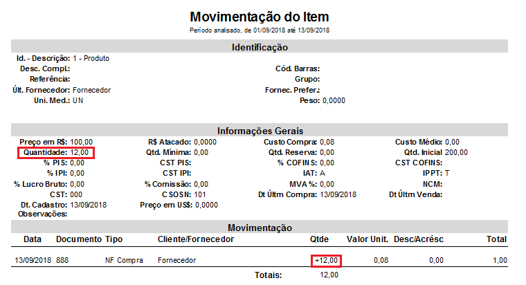 Após finalizar a nota, no caso desse exemplo, o produto teve sua quantidade alterada em 12 unidades, caso seja consultada essa informação no cadastro do produto ou então no relatório de movimentação do item.