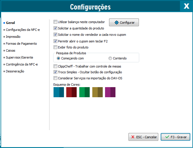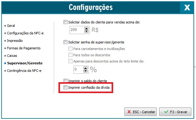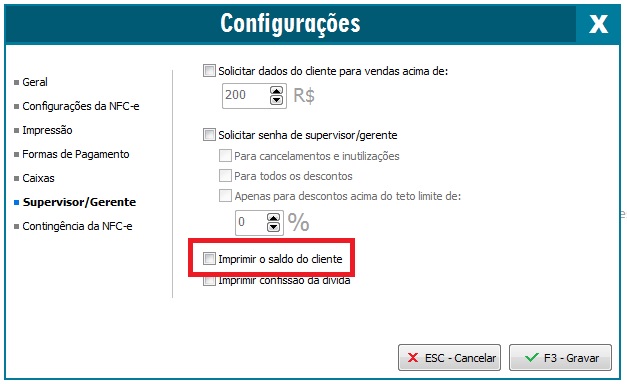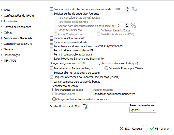 Possibilita efetuar configurações para que o supervisor possa limitar os descontos concedidos pelos caixas e para o cancelamento da NFC-e. Para que o caixa possa dar sequência ao procedimento de cancelamento e/ou desconto será necessário a autorização do supervisor.