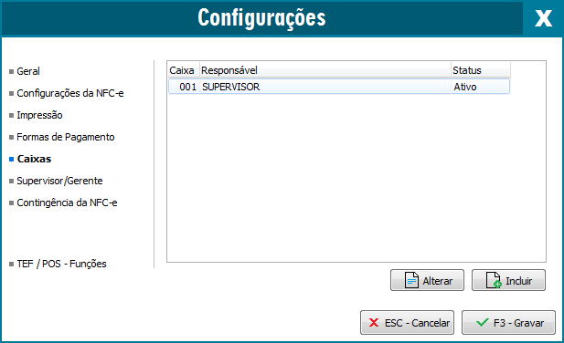 Permite incluir a quantidade de caixas que a empresa utiliza e informar qual é o responsável por cada um. Assim, com a configuração correta é possível realizar o controle por turno e vendedor ao realizar o fechamento do caixa.