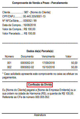 Marcando a opção Imprimir confissão de dívida será impresso um comprovante onde o Cliente poderá assinar que possui débito com a empresa (No caso de venda a prazo), o número de vias na impressão poderá ser configurado na aba Impressão.