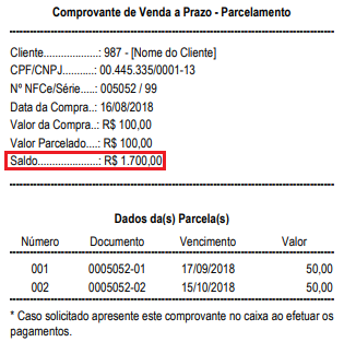 Marcando a opção "Imprimir o saldo do Cliente", será impresso um comprovante com o saldo que o cliente ainda possui na empresa, para casos onde no cadastro do cliente foi informado Limite de Crédito, para efetuar o cadastro do Limite de Crédito clique aqui.