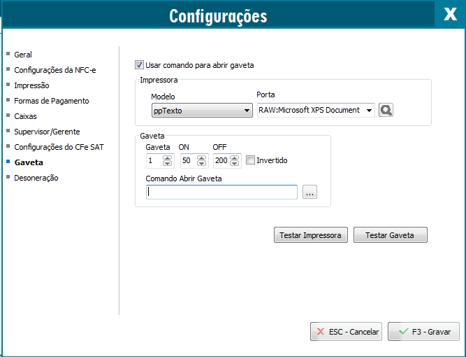 Existe a possibilidade de controlar a abertura da gaveta, onde abrirá a gaveta no momento da impressão da NFCe, para isso, marque a opção Usar comando para abrir gaveta, no MODELO escolha ppTexto, na Porta, defina a sua impressora;
