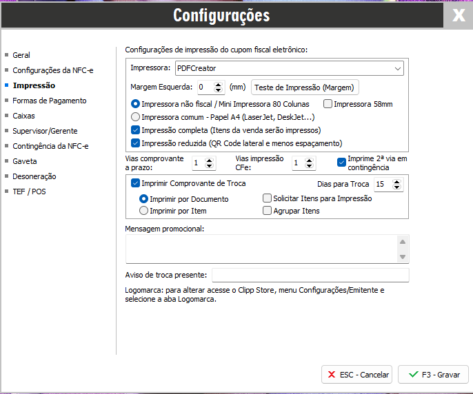 Também nessa aba de configuração, temos a opção de Imprimir Comprovante de Troca.