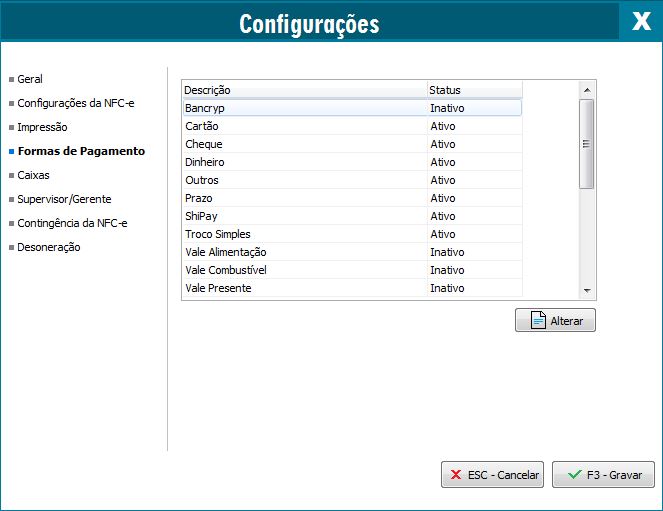 Poderá ativar ou inativar as formas de pagamento que são aceitas pela NFC-e, configure-as conforme sua empresa trabalha.