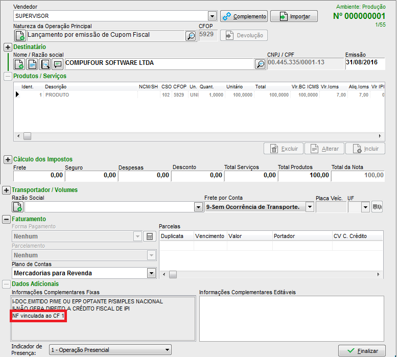 Confira todas as informações da nota e clique no botão Finalizar para transmitir/imprimir sua nota fiscal.