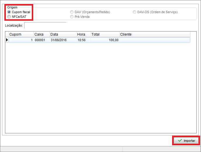Selecione a origem a qual se refere o documento fiscal, em seguida localize o mesmo e clique em Importar.