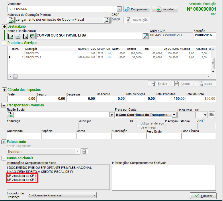 No campo Informações Complementares Fixas será apresentado o número do documento fiscal que foi importado.