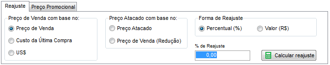 ATENÇÃO: Somente será possível realizar o reajuste com base em algum campo específico se o mesmo estiver devidamente preenchido no cadastro dos seus produtos.