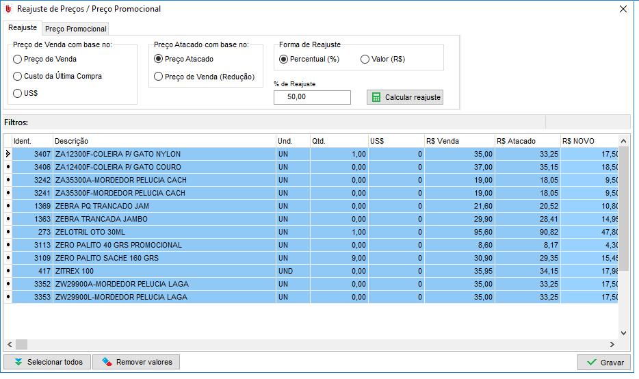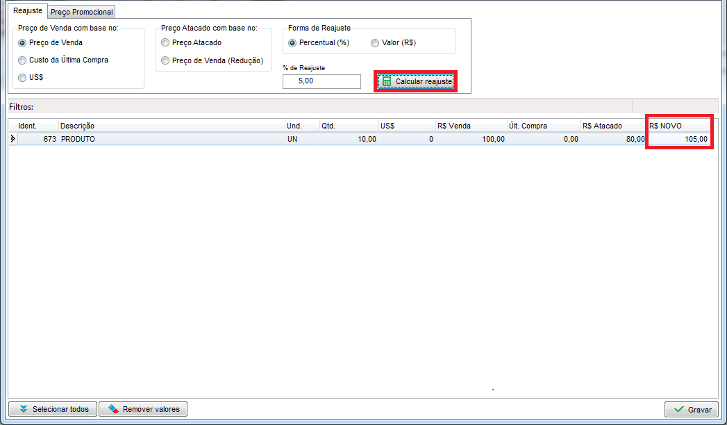 Após efetuar o procedimento, poderá verificar que o novo valor do produto será apresentado no campo R$ NOVO, para confirmar clique em Gravar, caso seja necessário recalcular os valores, clique em Remover Valores e reinicie o procedimento.