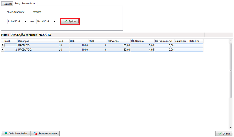 Neste momento, informe a porcentagem de desconto a ser aplicado sobre o preço de venda dos produtos, informe o período em que será utilizado o preço promocional nas vendas e posteriormente clique no botão Aplicar e em seguida em Gravar. Caso tenha aplicado algum valor incorreto, clique em Remover Valores e reinicie o procedimento.