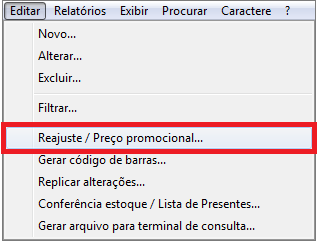 Para definir um preço promocional para os produtos do seu estoque, clique no menu Editar e acesse Reajuste de Preços / Preço Promocional. Em seguida clique na aba Preço Promocional.