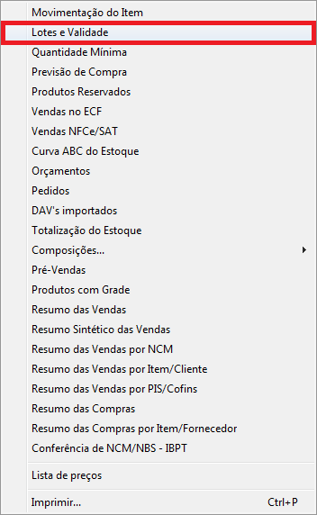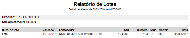 Quando o produto de lote estiver vencido, o mesmo será apresentado no relatório normalmente, porém, com a data na cor vermelha indicando o vencimento.