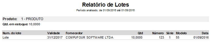 Serão listados no relatório, os lotes com as respectivas quantidades e as informações da nota de entrada, sendo estas informações agrupadas por produto.