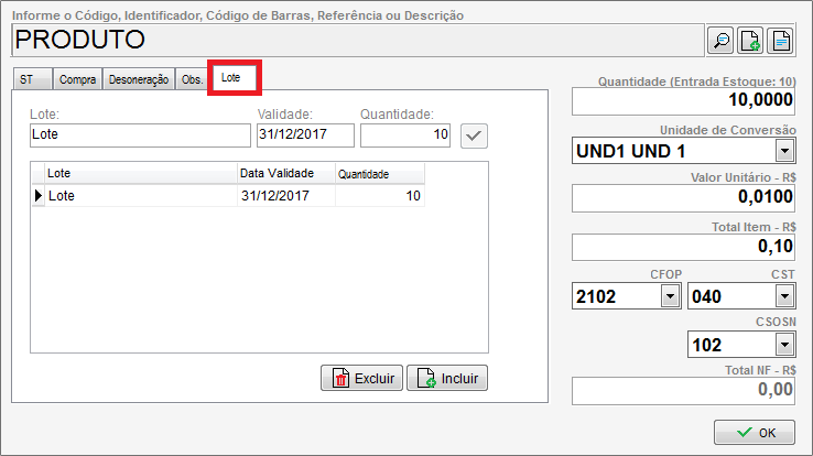 Para realizar o cadastro do Lote, ao incluir um item na Nota de Compra, clique na guia Lote e informe o número do Lote, a Validade e a Quantidade. OBS: A soma das quantidades informadas na guia Lotes, deverá ser igual a informada no campo Quantidade, lançada no produto.