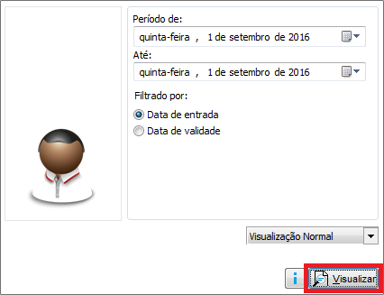 Este relatório pode ser gerado com base na data de entrada da nota ou pela validade do lote. Selecione o período e a opção desejada e clique em Visualizar.
