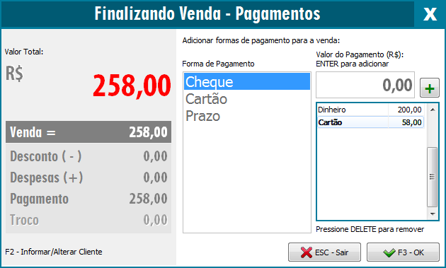 Neste exemplo vamos dividir a venda nas formas de pagamento Dinheiro e Cartão. Por exemplo, selecionamos a forma de pagamento Dinheiro, digitamos o valor de R$ 200,00 e clicamos no botão "+", para posteriormente selecionarmos a forma de pagamento Cartão e clicarmos novamente no "+" para incluir o restante do valor.